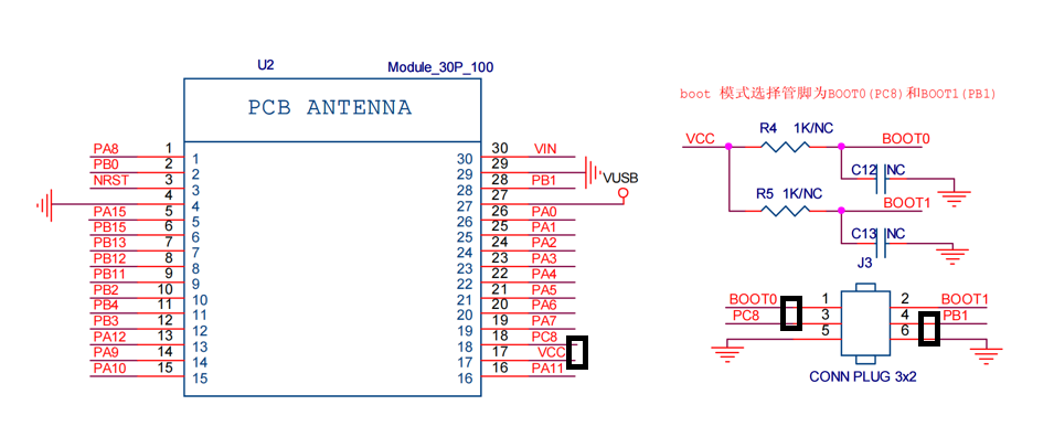 先弄明白启动顺序设置。这一步主要就是缺少傻瓜的方法。前人也是各显神通,想了不少办法。简单点的就是PC8接VCC,确保将Boot0拉高,Boot1接地。然后就是找到PA6和PA7,按照TX、RX的传统接法接到USB to TTL上。