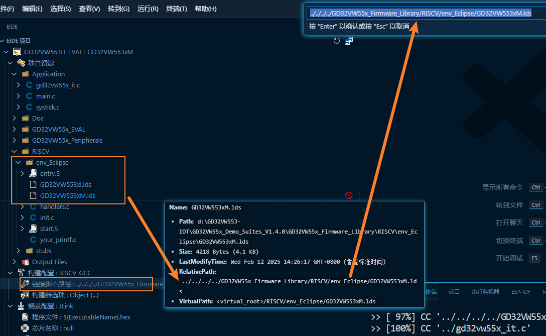 将显示的相对路径位置复制到上方:../../../../GD32VW55x_Firmware_Library/RISCV/env_Eclipse/GD32VW553xM.lds