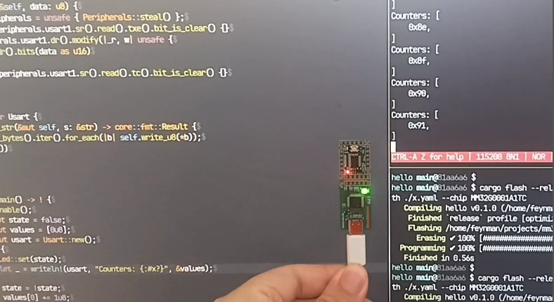 同时用 SVD 生成 Rust 的 PAC,用先前文章类似的思路就可以写出下面的 UART 串口和 LED 控制程序.