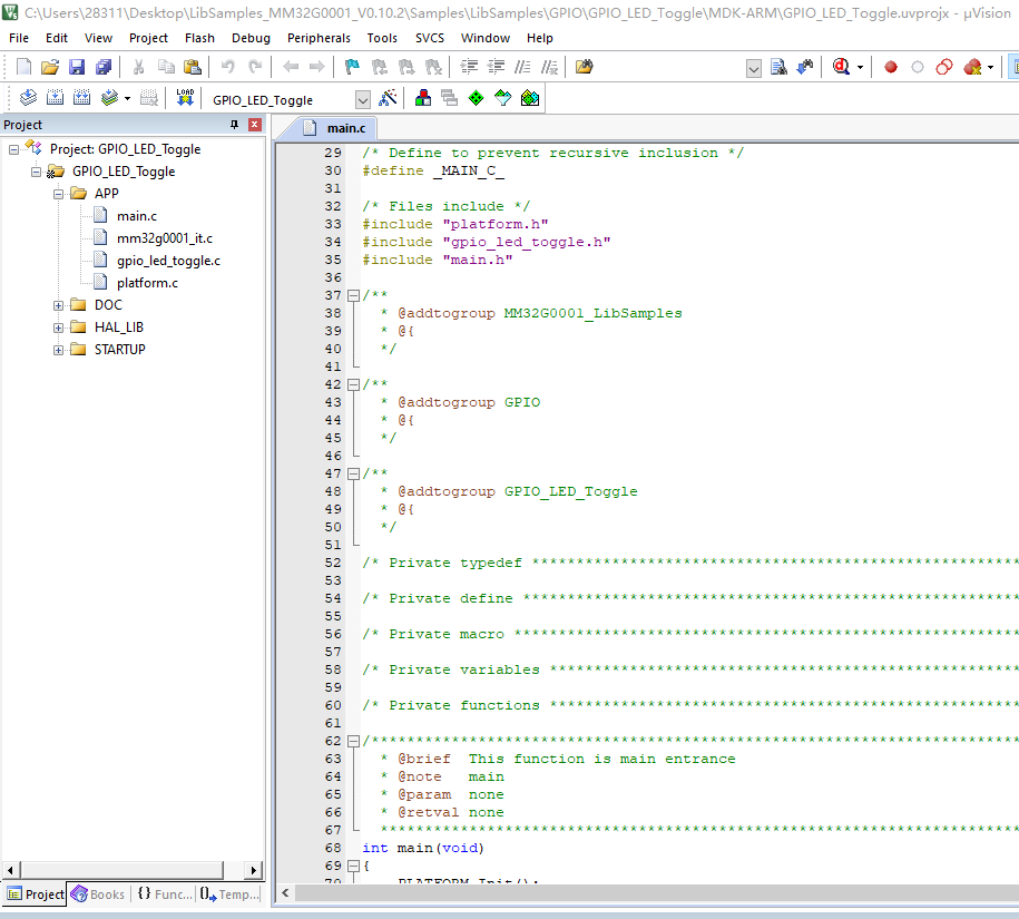 3.直接利用电路板载的MM32LINK-OB进行烧录,方法是:先打开例程中的LED_Toggle工程,见下图,