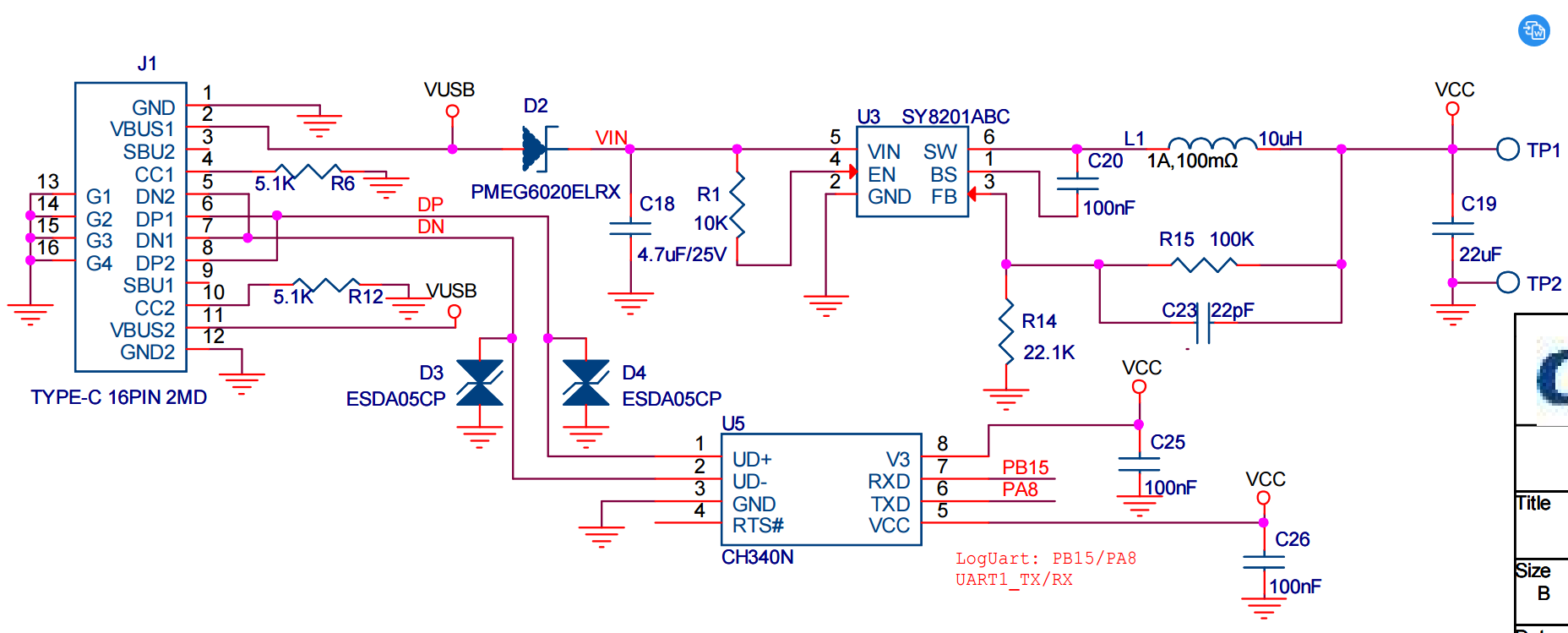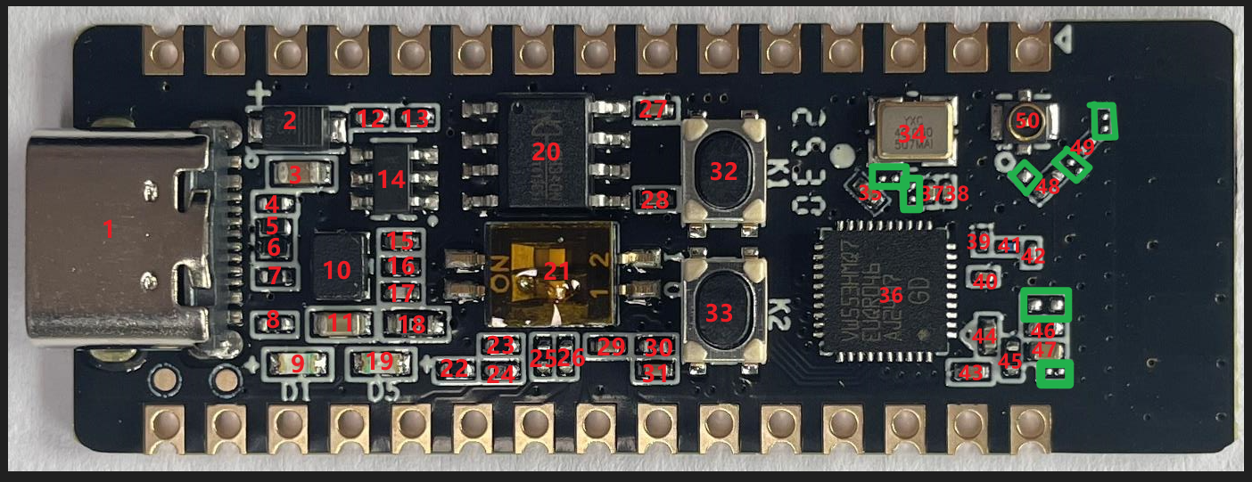接口采用了16引脚的TypeC接口,通过原理图可以看到,这个接口支持供电(VBUS)、接口协商(CC1/CC2)以及数据传输(DP/DN)。没有高速传输,且作为扩展功能接口的SBU被悬空,当然,在这块开发板中,这些功能也不需要,也没必要设计。作为开发板的Type-C接口,它已经充分的完成了自己任务。