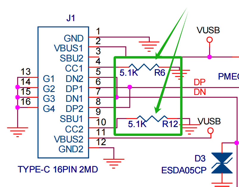5.1KΩ的下拉电阻,这表示这块设备属于受电端。当电源端会检测CC引脚,如果检测到下拉电阻时,就会识别到受电端的存在,让后给受电端供电。