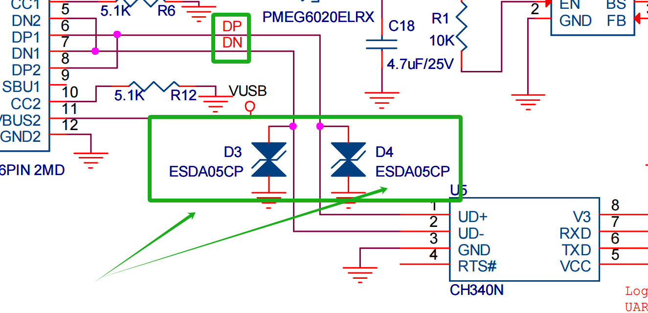 DP等价于D+(数据正信号),DN等价于D-(数据负信号)。而且还在上面安排了TVS,作为静电和浪涌保护。这个设计很重要,不过很多人会忽视掉,甚至包含卖串口工具的商家。
