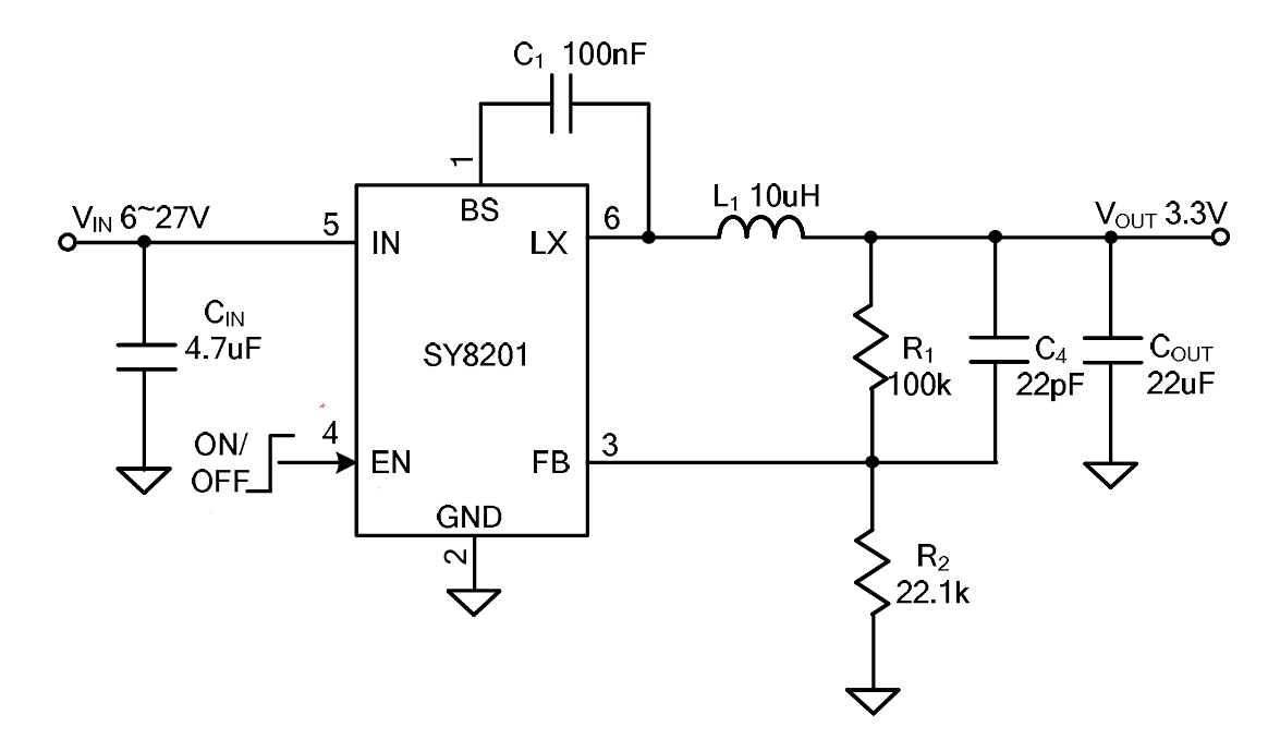 通过查阅SY8201ABC的手册,可以得知,这块开发版是输出3.3V的设计。