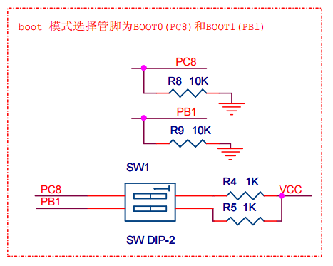 BOOT1和BOOT2从MCU引出来是直接接入下拉电阻的,通过拨码开关接入上拉状态。使用这个方式给BOOT进行了置0和置1的操作。让我们看看官方手册是怎么解释的这一段内容吧: