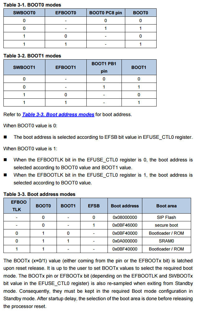 BOOT0=0,启动地址由EFUSE_CTL0的EFSB位决定,支持从SIP Flash(0x08000000)或secure boot 区域(0x0BF46000)启动; - 若