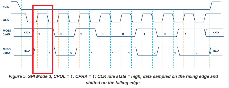 模式3(CPHA=1,CPOL=1):空闲时为高电平,上升沿(高电平)采样,低电平改变数据。