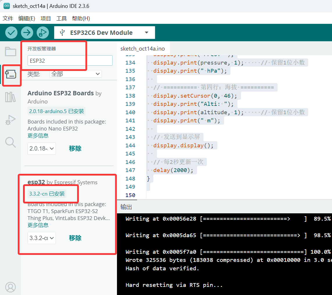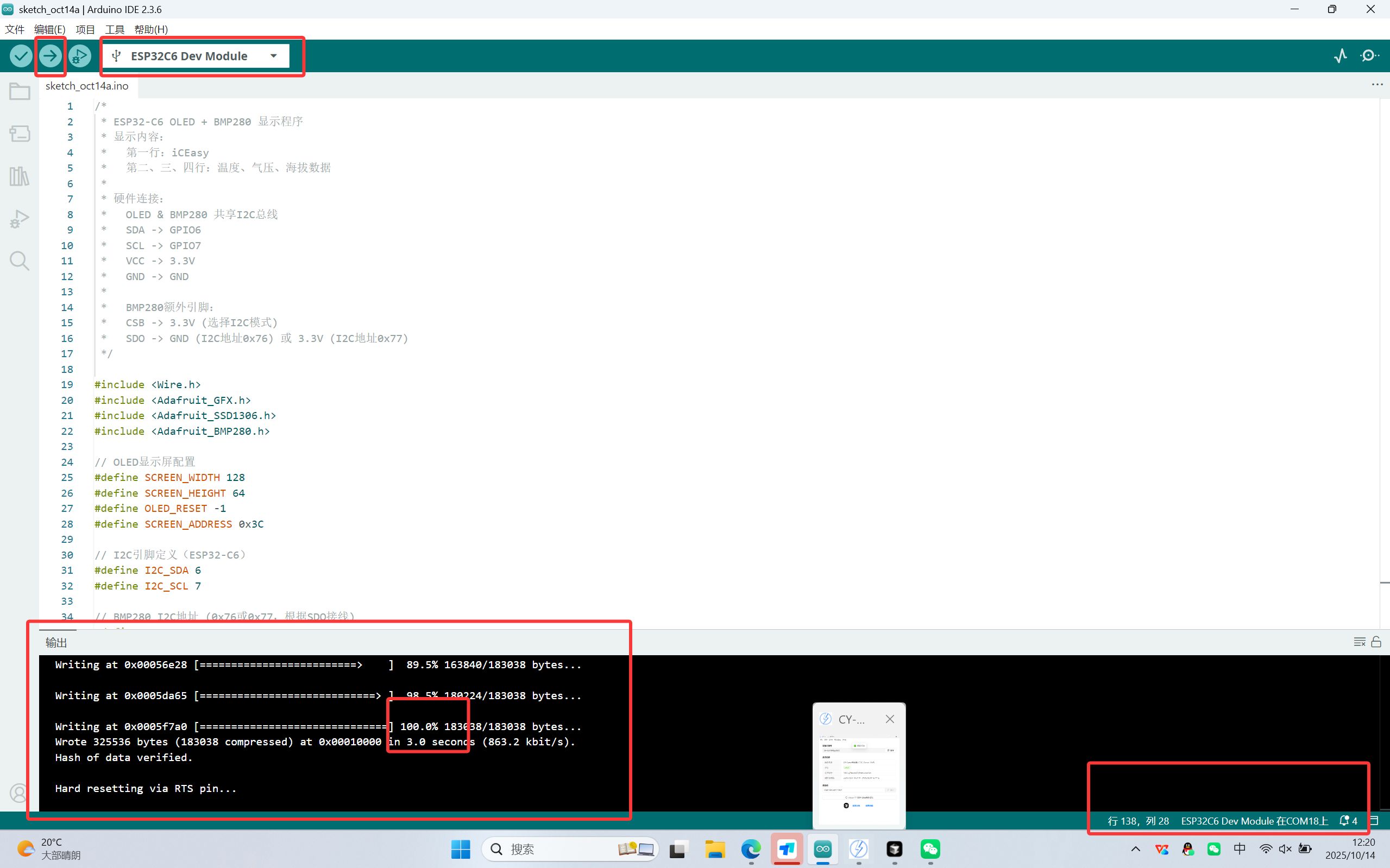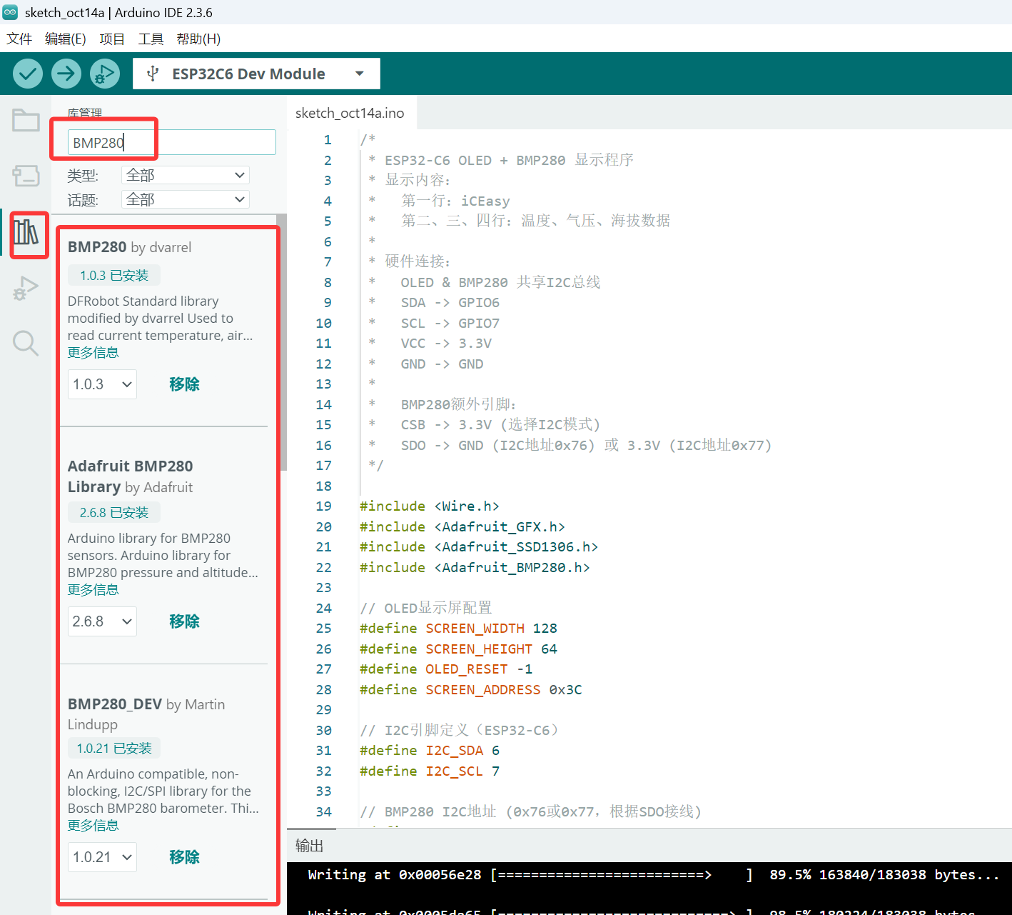 本项目展示了如何使用ESP32-C6控制OLED显示屏和BMP280传感器,实现环境数据的实时监测与显示。项目具有以下特点: