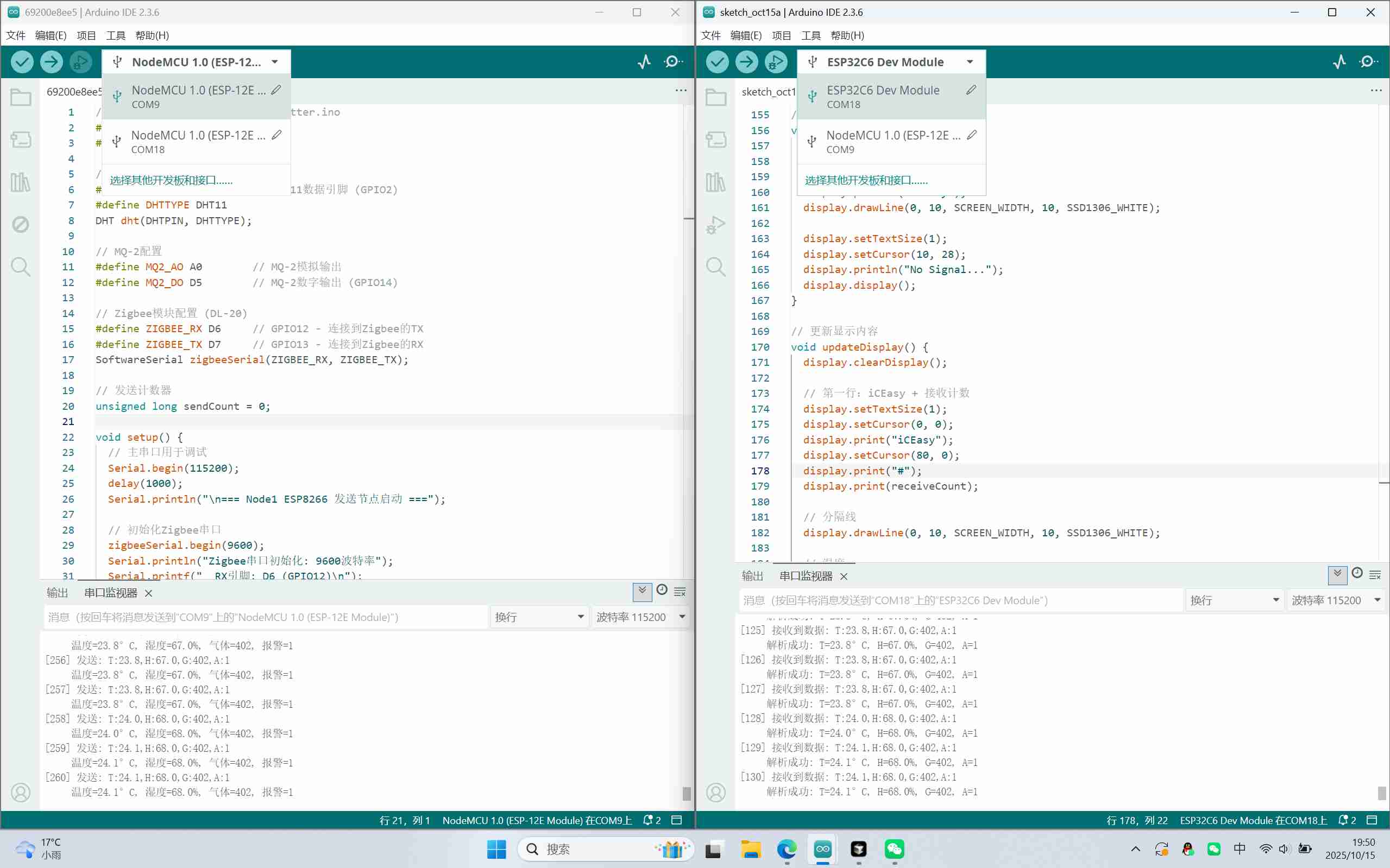 节点一(发送端):ESP8266 NodeMCU + DHT11温湿度传感器 + MQ-2气体传感器