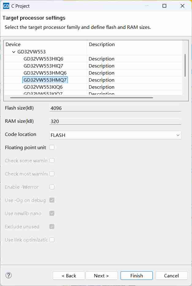 芯片型号选择 GD32VW553HMQ7,最后点击 Finish 完成创建。