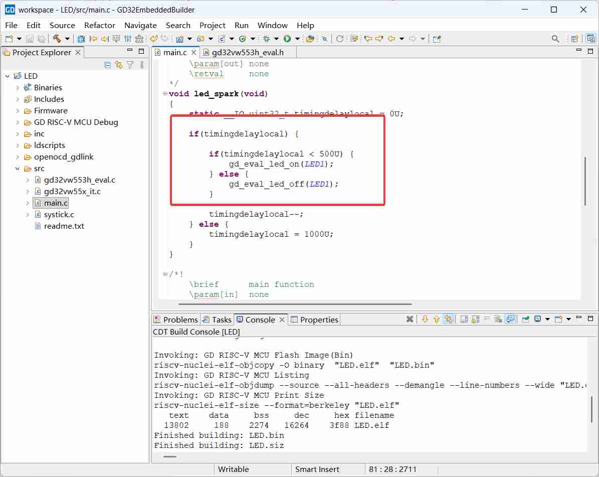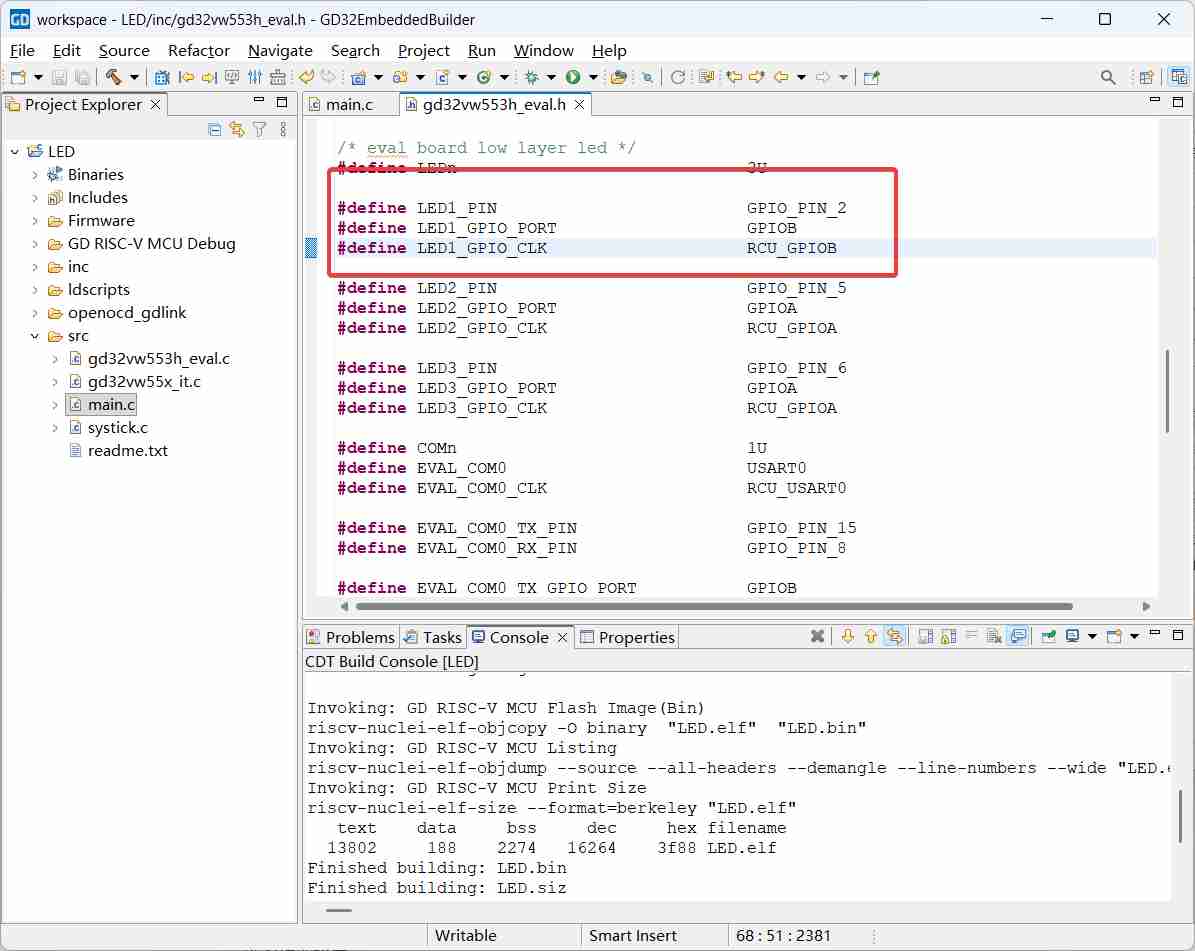 默认示例中 LED 引脚定义与板载 LED 不一致,因此需要手动修改。