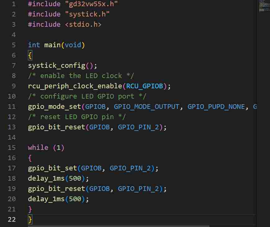 以上代码先初始化systick_config,然后使能GPIOB的时钟,设置为推挽模式完成GPIO初始化,最后通过反转电平完成LED的闪烁,代码简洁,简单入手