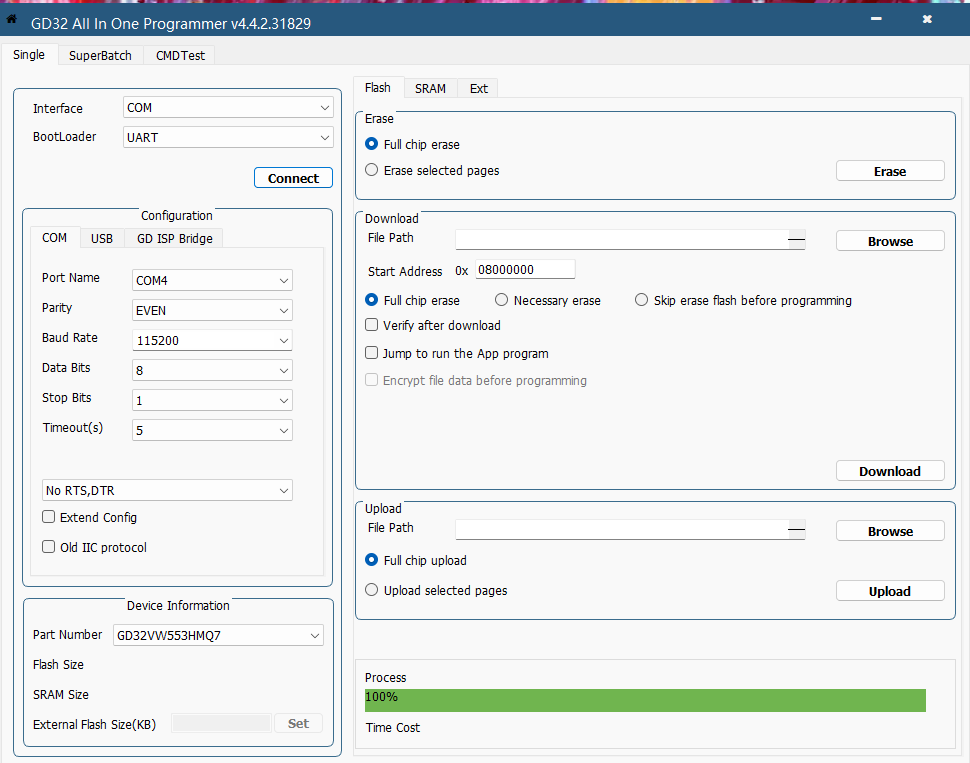 然后在将BOOT1拨至ON,BOOT2不变,C口连接电脑,打开烧录程序