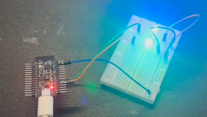 点击download下载,下在完成后记得将BOOT1拨回原来的位置,然后连接电路如图,LED灯闪烁