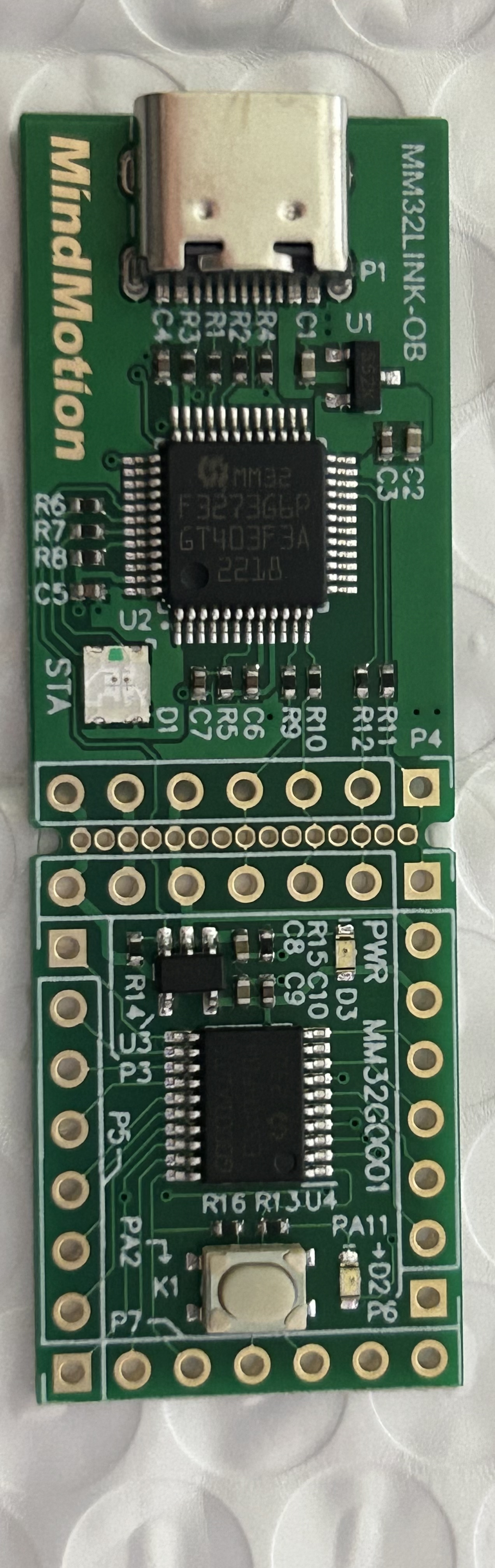 左边是仿真器,用的是Type-C接头,右边是MM32G0001的是小系统板。
