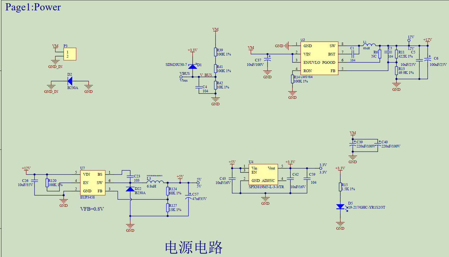 由于我购买的直流无刷电机是DC24V,所以电源输入电压我配置的是DC24V 2A的电源输入, 输入电压并经过U2LM5164转换为 12V,为Gate driver IC提供稳定的电压输入;5V、经过U4SPX3819 3.3V 电压输出给到MCU微处理器,硬件上的电平转换如下: