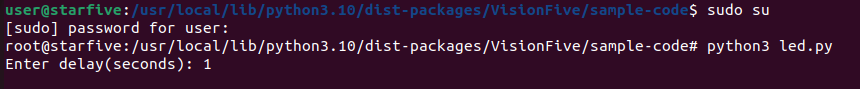 按照官方文档操作这里这里依然会有权限问题,正确做法是在安装VisionFive.gpio之前一定要事先sudo su再执行python3 -m pip install VisionFive.gpio-1.3.0-cp310-cp310-linux_riscv64.whl。不然装完切到目录cd /home/user/.local/lib/python3.10/site-packages/VisionFive/sample-code/发现权限不够,即使临时sudo su发现还是报错No module named 'VisionFive’,原来所有安装都要在su状态下完成,这样就能完全拥有硬件操控权限
