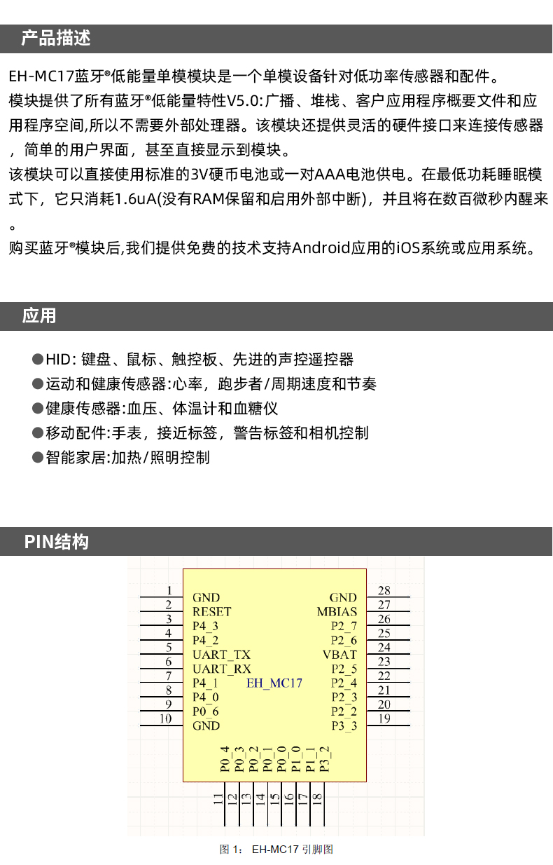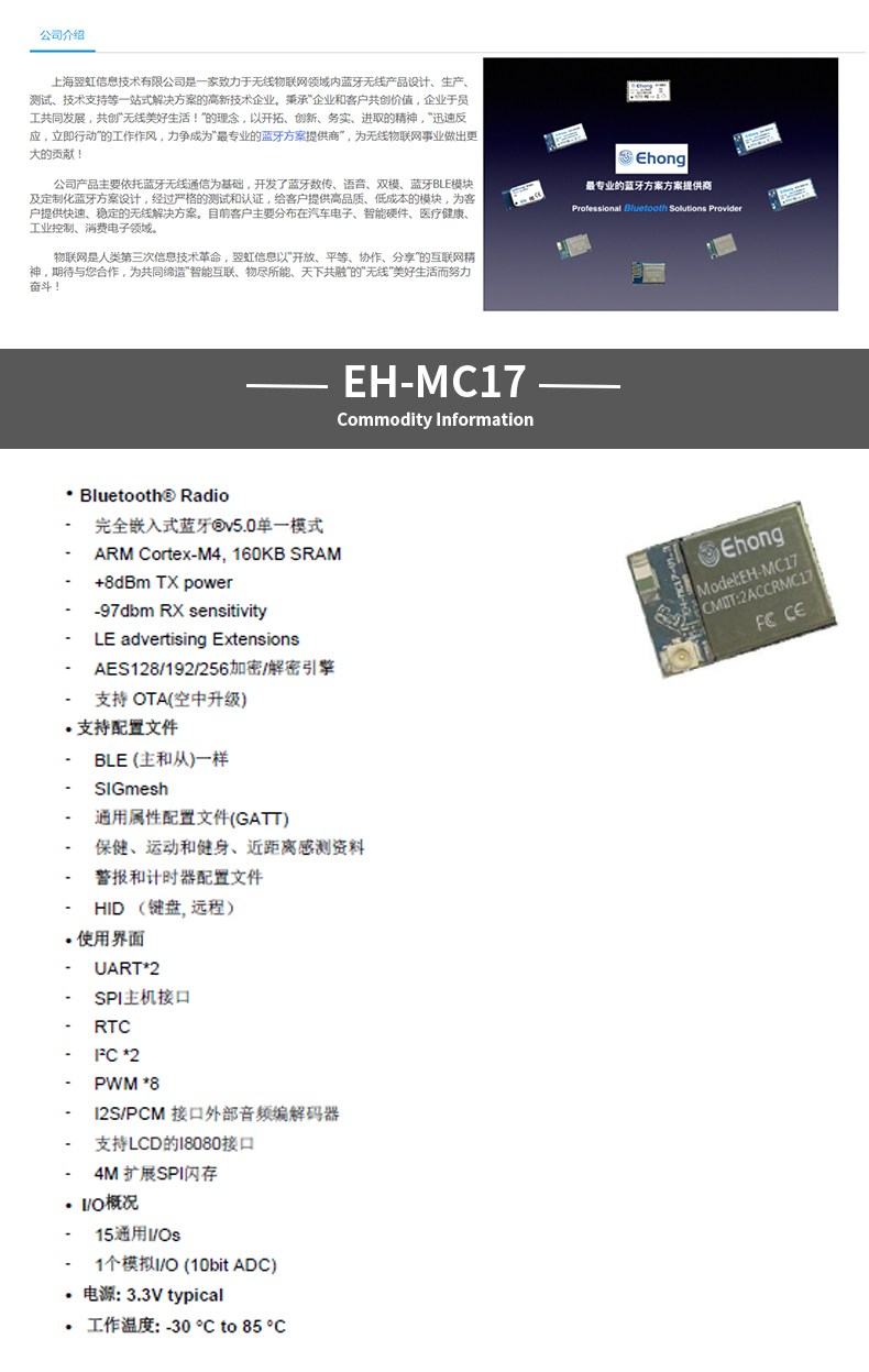 Ehong 低功耗 模块 EH-MC17 嵌入式 音频 传感器 串口接收器 5.0蓝牙模块